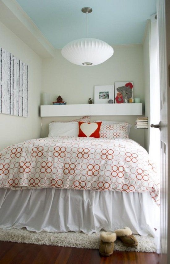 Чаще всего свободное место между потолком и изголовьем кровати оставляют пустым. В некоторых ситуациях там встречаются излюбленные фотографии или сувениры, размещенные на полочке. Однако, на самом деле это пространство можно использовать очень эффективно, чтобы преобразить внешний вид помещения. Идеальное решение в этом случае – подвесить в этой области навесной шкафчик аккуратной формы, который можно приобрести в мебельном магазине или изготовить на заказ. Благодаря ему не только украсится комната, но и решится проблема, связанная с хранением вещей.