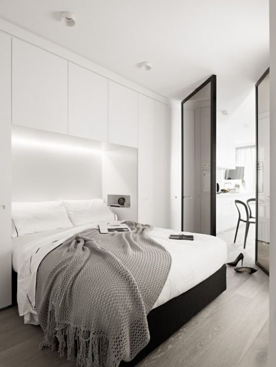 Небольшую комнату в белом цвете можно сравнить с женщиной в маленьком черном платье – она будет выглядеть роскошно и стильно. Главное преимущество такого решения для спальни заключается в том, что помещение визуально расширится. Сейчас не все решаются использовать данный прием, ошибочно полагая, что спальня «превратится» в больничную палату. Однако, если посмотреть на ситуацию с другой точки зрения, то белую спальную в разы легче изменить при необходимости. К примеру, можно использовать несколько ярких аксессуаров, которые придадут спальне особое настроение. А чтобы сделать комнату более уютной, можно применить вязанный плед или любой предмет, изготовленный из дерева. Одним словом, на фоне белой стены можно использовать один цветовой акцент, который способен изменить атмосферу.