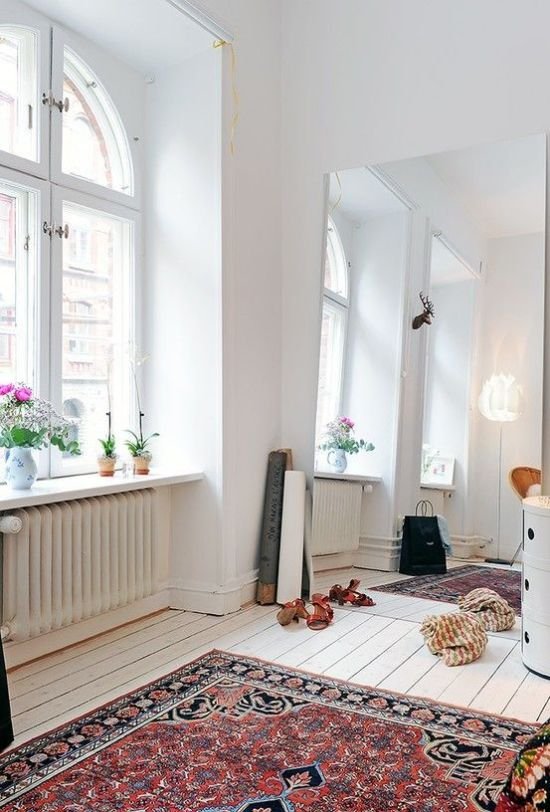 Если в комнате установлено большое напольное зеркало, то она автоматически напоминает дизайнерские апартаменты Нью-Йорка или Парижа. К примеру, такое решение будет иметь вид элегантной небрежности, если зеркало всего-то прислонить к поверхности стены. Но, необходимо позаботиться и о безопасности. Так, если в доме есть ребенок или домашний питомец, лучше выбрать модель, дополненную подставкой или же вариант зеркала-псише.