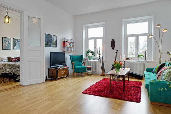 Вся цветовая палитра в скандинавском стиле состоит из светлых пастельных тонов (молочно-белый, голубой, серый) с яркими вкраплениями желтого, вишневого, терракотового.