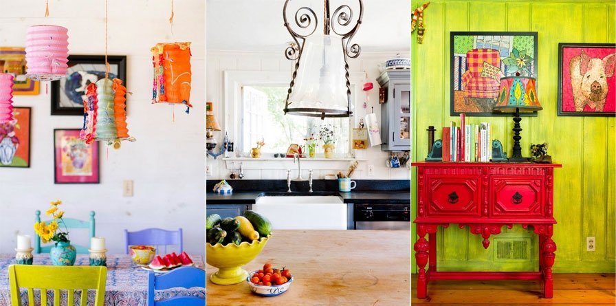Для стиля Китч типичны яркие, броские цвета, подделки под шикарные материалы, переизбыток декора. При оформлении помещения используют множество картин, статуэток, и не сочетаемых между собой цветов. Этот стиль очень часто можно встретить в мастерских творческих людей, которые не привыкли следовать всеобщим правилам. Для создания такого стиля приобретают и хрустальные люстры, восточные вазоны, античные колонны, лепнину с позолотой, картины в рамках, фонтаны и садовых гномов, шкафы и мебель с резными элементами, то есть всё что может показать зажиточность.