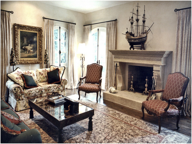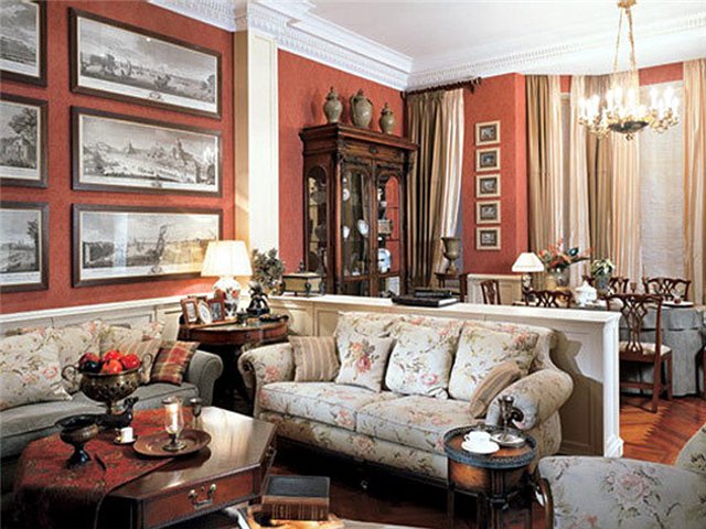 Оформляя гостиную комнату нужно учитывать качество текстиля, необходимы пледы и диванные подушки, причем везде, где можно присесть, они должны гармонично дополнить шторы. Стены могут быть облицованы деревянными панелями с орнаментальным узором, высотой не более 2/3 стены, в сочетании с плотной фактурой обоев в полоску или мелкий рисунок.