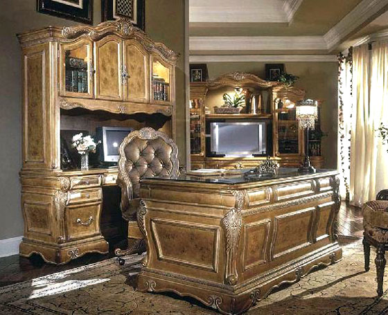 Мебель в такую комнату подбирают из массива дерева крепких пород: дуб, ясень, тис, орех и т.д. Но, несмотря на это гарнитур должен выглядеть изящно с претензией на изысканность. Мягкая мебель приобретается только с натуральной оббивкой.