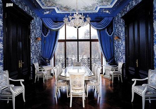 Теплая атмосфера комнаты поддерживается мягкими оттенками кремового, бежевого цвета и поверхностями из натуральной древесины. Создавать эту атмосферу помогают даже картинные рамы, покрытые матовой позолотой. Все эти теплые тона находятся в цветовом контрасте с ярким синим цветом обивки, книжных переплетов и мебельных каркасов, в результате чего создается обстановка, идеальная как для семейного общения, так и для приема гостей.