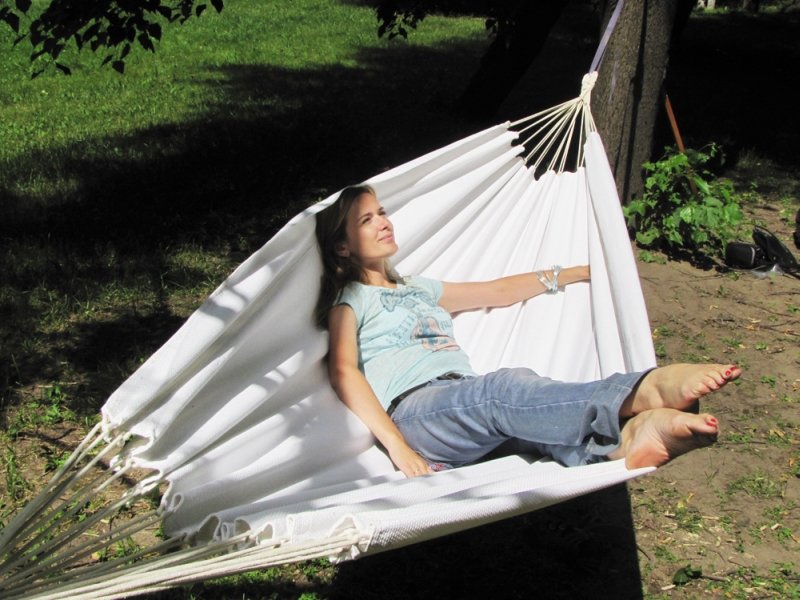 Для того, что достичь этого эффекта, присматривайтесь к достаточно широким моделям. Если предпочитаете гамаки-сетки, то проследите, чтобы материал был хлопковым и плоским. Наилучшие модели – те, которые оснащенные двумя планками из дерева. На данный момент рынок позволяет выбрать различные гамаки – одно, двух или трехместные, разных цветов и конструкций – с тентами, стойками и так далее.