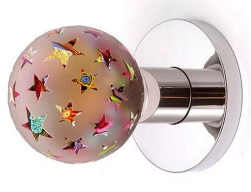 «Магический кристалл» - еще одна модель необычной дверной ручки. Форма этой фурнитуры имеет вид шара, а изготовлена из такого строительного материала, как стекло. Особенностью можно назвать спрятанный внутри шара предмет, будь то замок, жук или ключ.