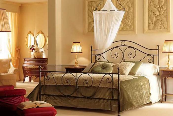 Кованную мебель, с помощью которой декорируют помещения, может быть приобретена в комплексе или отдельным модулем. Не стоит переживать даже в том случае, когда у вас маленьких размеров комната, ведь ее без проблем можно украсить кроватью с тонкой, но изящной металлической основой. Однако, если пространства в жилье достаточно, простора для применения кованных элементов можно найти немало: спальня украшается не только кроватью и туалетным столиком, но и торшерами с металлической основой, карнизами, аккуратными книжными полками. Металлическое кружево – наиболее оптимальный выбор, ведь за подобной мебелью легко ухаживать, а ее прочностные характеристики достаточно высоки.