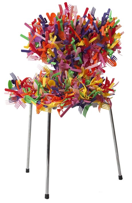 Посиживать в кресле, спинка и сиденье которого обклеены ножиками и вилками, очевидно не очень удобно, но представьте, будто это ваш личный протест к фразе "место дамы у плиты". Это обязано подействует.