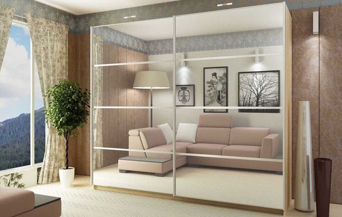 • зеркальный шкаф-купе. Многим известно, что с помощью зеркал можно визуально увеличить пространство. В случае, если площадь вашей квартиры небольшая, то шкаф-купе с зеркальными поверхностями является необходимым видом мебели. К тому же, зеркало справляется с утилитарной ролью, ведь время от времени вам или гостям понадобиться посмотреть на свое отражение, чтобы поправить одежду, прическу и так далее. На данный момент выпускаются серебристые, бронзовые или графитовые зеркальные дверцы;