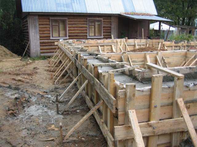После выбора материалов, устанавливают опалубку и производят profibrus.ru с соблюдением всех правил по технологии. Необходимо при этом в дно траншеи вбить в строго вертикальном положении с шагом два метра прутья. Делают высоту прутьев с высотой фундамента.
