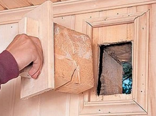 - Приточное отверстие обустраивают прямо за печкой на высоте не более 0,3 метра от пола. Прямо над этим же отверстием, делают ещё одно отверстие для выхода воздушных масс, на таком же самом расстоянии, но только от потолка бани.