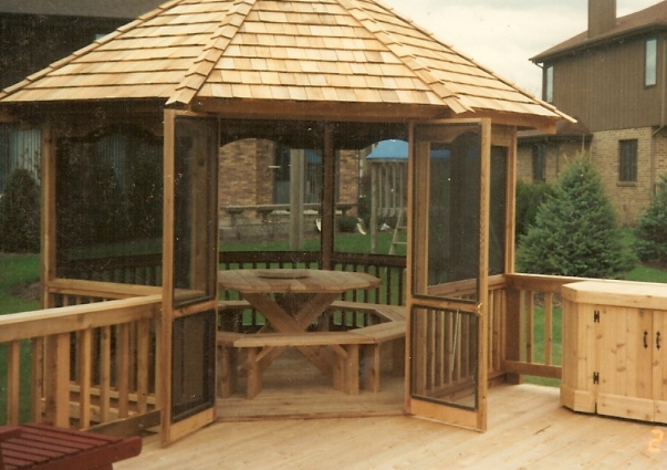 Вот, по сути, и готова беседочка, остаётся только поставить стол с лавочками или стульями и сидеть отдыхать от работы по вечерам или просто коротать выходные. Все деревянные части беседки рекомендуется покрыть олифой, что бы те не портились от воздействия окружающей среды.