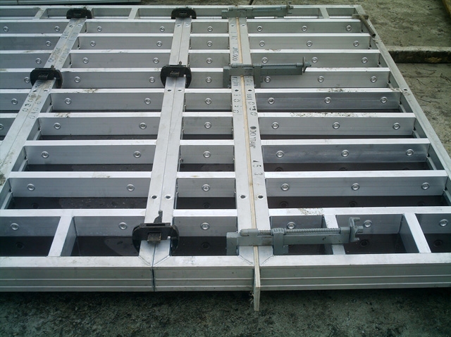 Особо надо отметить ее надежность, она может выдержать нагрузку до 8 тонн на один квадратный метр, и благодаря этому конструкция на такой опалубке, будет ровной, без дополнительной доработки. К недостаткам, щитов из алюминия можно отнести, увеличение времени работ, так как при заливке бетоном, надо давать время для того, что бы бетонный раствор набрал крепость, ведь заливка бетона производиться слоями.