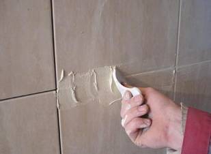 До начала затирки плиточных швов, их необходимо очень тщательно очистить от остатков плиточного клея. Это делается легче, если предварительно плиточные швы смочить водой. При использовании металлического инструмента работу надо проводить очень осторожно, иначе можно сколоть эмаль плитки. Гораздо удобней при этой работе использовать твердую поролоновую губки и заточенную деревянную палочку.