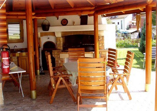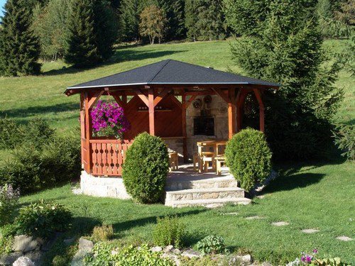 В строительстве сооружений стиля кантри применяются добротные и достаточно дорогие строительные материалы, поэтому в результате получается качественная и долговечная красота. Часто беседку оформляют высококачественным профилированным брусом, как и в английском стиле. А вот вместо традиционной печи тут легко установить газовый гриль-барбекю.
