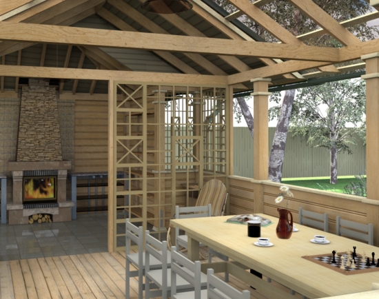 Пол стоит уложить досками и вскрыть лаком. Для отделки потолка можно использовать доски, покрытые олифой или гипсокартон, с помощью которого можно добиться интересного дизайна. Придать интерьеру оригинальности смогут глиняные и фарфоровые вещи, а также изготовленные из резного дерева. В общем, летняя кухня — это место для приема пищи, а также для приятного времяпрепровождения и единения с природой.