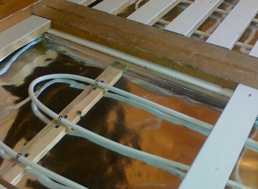 Перед тем как уложить трубы, прокладывают гидравлический барьер. Следующий этап — укладка теплоизоляции отражателем тепла. Лучше использовать пенопласт плотный. Рекомендуется выбирать плотность, учитывая нагрузку. Оптимальной плотностью считается 35я. Далее укладывают трубы. Их крепление производят на кронштейны, которые установлены в стяжку.