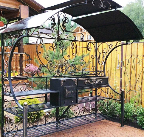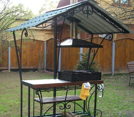 Изготавливаются мангалы для дачи с крышей из высокопрочной стали, кованые стойки мангала украшаются резьбой и декоративными фигурными элементами, широкие основания стоек обеспечивают устойчивость и надежность конструкции. Жаровня мангала изготавливается из толстой жаропрочной стали или чугуна, и может иметь съемные внутренние перегородки, позволяющие уменьшить ее объем с целью экономии топлива. На краях жаровни прорезаются специальные канавки, позволяющие устанавливать на жаровню шампуры и регулировать их положение в процессе приготовления шашлыков.