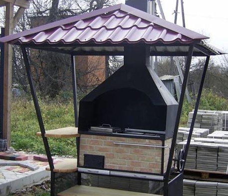 Стационарные мангалы для дачи с крышей представляют собой пару массивных опорных стоек, которые можно надежно установить на ровной поверхности дачного участка или даже закрепить в грунт. На стойках устанавливаются жаровни, ящики или полки для дров и угля, перед жаровней может располагаться полка, выполняющая функции столика для шампуров или полуфабрикатов. На верхних концах опорных несущих стоек устанавливается крыша, защищающая жаровню и приготовляемые продукты от атмосферных осадков, пыли, падающей листвы. Стационарные мангалы обычно имеют разборную конструкцию, и при желании его можно разобрать и убрать в подсобное помещение на хранение.