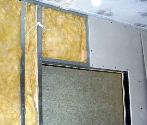 Защититься от посторонних звуков получится, если в каркас уложить материал с высоким уровнем шумоизоляции. Такими качествами обладает, например, минеральная вата. Ее сразу необходимо нарезать так, чтобы плиты входили плотно между стойками. Когда работы выполняются в помещении с влажным воздухом, нужно уложить еще и гидроизоляционный слой.
