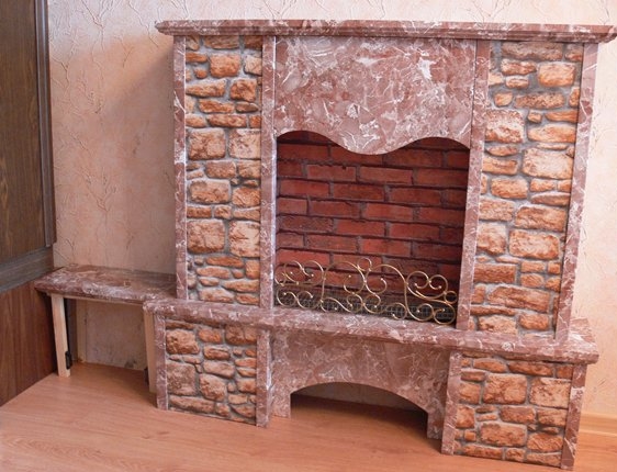 • Фальшкамин с реалистичной имитацией максимально повторяет натуральный камин своими габаритами и внешней отделкой. Внутрь помещаются источники тепла: различные горелки или электрокамин. В создании такой конструкции используются огнеупорные материалы, а иногда устраивается настоящий дымоход.