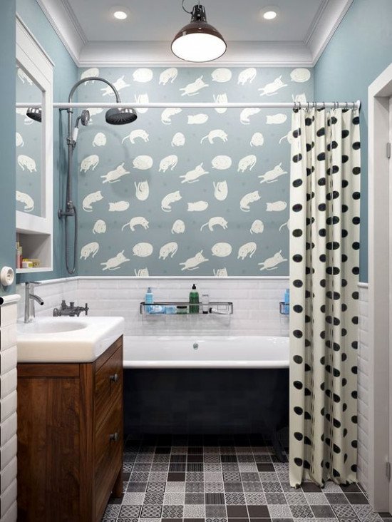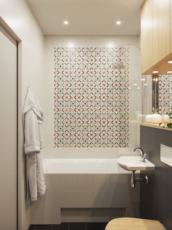 По мнению многих специалистов и декораторов, оформляя ванную комнату следует придерживаться светлых оттенков. Такое решение, безусловно, является грамотным, однако, чтобы оформление не казалось слишком скучным и серым, необходимо задействовать акценты и контрасты. Если речь идет о большой ванной комнате, то в ней лучше всего выложить бордюр – такой прием на данный момент пользуется большой популярностью. Но, если вам достался небольшой санузел, его лучше не «дробить» линиями по горизонтали, так как в таком случае чувство тесноты лишь усугубится. В этом случае оптимальное решение – выкладывание небольшого панно на стене при помощи контрастной плитки или выделение горизонтальных линий. Также неплохо с задачей справляется метод акцентирования внимания на полу, что является не только стильным, но и практичным решением.