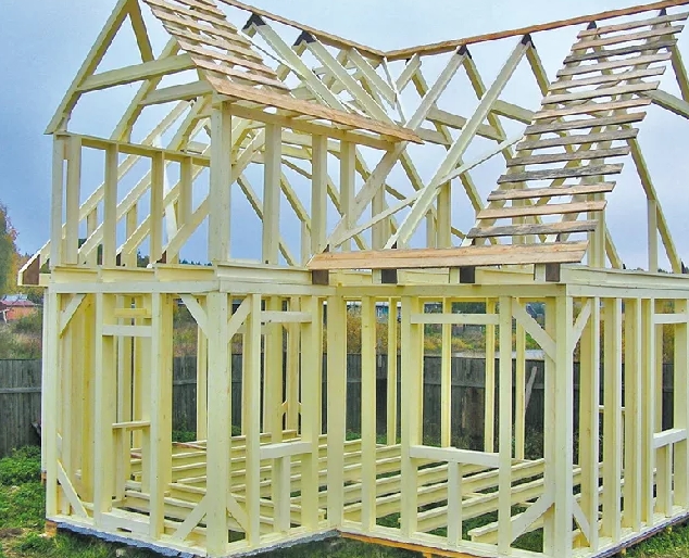 Сначала надо будет заложить основу. Советуем ленточный фундамент, он прост в обустройстве и надежен. Нужно будет выкопать траншею, разумеется, после предварительной разметки и потом залить ее бетоном. Также не забудьте про армирование и установку опалубки. Далее строительство каркаса. Как вы, наверное, понимаете, каркасное строительство подразумевает возведение несущего каркаса здания. Для этого вам понадобится брус.