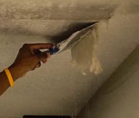Следующим этапом является удаление старого слоя отделки. Процесс довольно кропотливый, но не беспокойтесь, вы сможете справиться. Для начала требуется надеть очки и какую-нибудь одежду, подходящую для грязных работ. Взяв шпатель, начните соскребать поверхность потолка или использовать менее пыльный способ. Возьмите пылесос и поставьте его в режим, когда он будет выдувать, а не всасывать. Распылите воду на потолок, подождите несколько минут и спокойно снимите верхний слой потолка, который без упорства будет слезать.