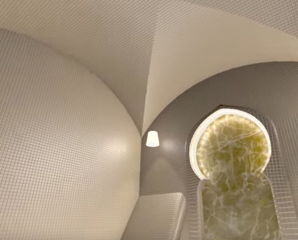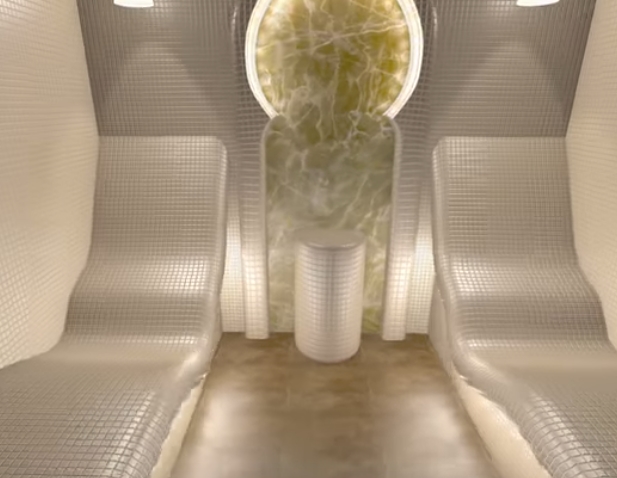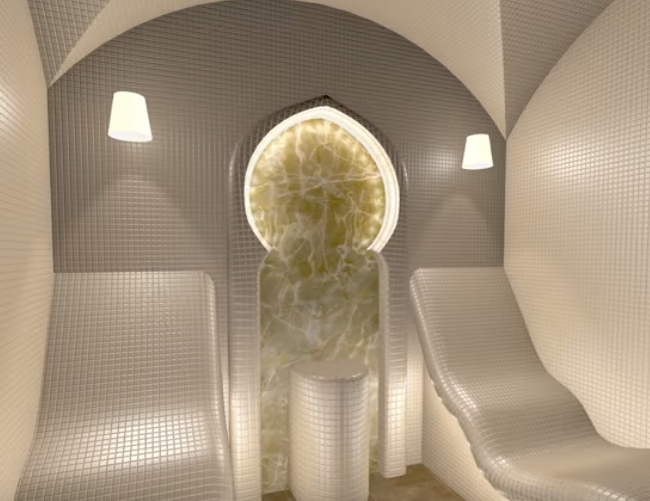 Изначально в классическом хамаме использовались натуральные камни. Из них делали лежаки, сиденья, массажные столы, подставки, украшения, оформляли ванны и купола. И неудивительно, ведь хороший плотный камень обладает отличной теплопроводностью, достаточно долговечный и не поддается влиянию воды. Последнее, кстати, зависит от количества железа в минеральном составе камня. Например, некоторый мрамор с большим содержанием железа внутри способен «цвести» от влаги, а в хамаме ее предостаточно. Поэтому для защиты мрамора и украшения зала поверх камня часто накладывалась красивая мозаика, которая делала помещение более сказочным и экстравагантным.