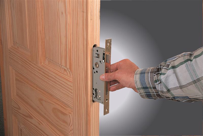 До установки замка необходимо выбрать для него место в дверной коробке так, чтобы скважина замка располагалась на высоте, удобной для вас. Затем ,замок нужно приложить на торец полотна двери и разметить место, где будут находиться пазы врезаемого замочного корпуса.Паз вырезаем с помощью дрели и долота, внутренность зачищаем стамеской. Диаметр сверла должен быть меньше паза по ширине. Вставляя замок в паз ,контролируем его глубину, которая должна быть больше корпуса на толщину планки(2-3 мм).На месте расположения планки необходимо сделать дополнительный паз стамеской, чтобы ее плоскость была заподлицо с дверным торцом.