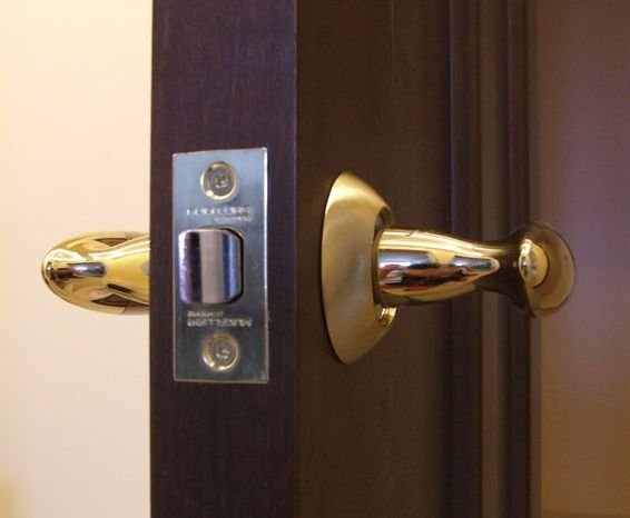 В случае, когда врезаемый замок защелкивается при помощи конструкции с язычком, то стоит сделать отверстие для стержня. С его помощью соединяются рукоятки с двух сторон. Так же необходимо проделать отверстие под переключатель винтов, которые обеспечивают стягивание накладок, и защелки.