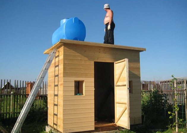Внутри же, кабину можно отделать ПВХ-пленкой. И, конечно, в завершении на крышу следует установить бочку с большим объемом, чтобы насладиться плодами своего труда всласть. Сразу, как солнце достаточно нагреет воду в бочке, смело тестируйте свое творение.