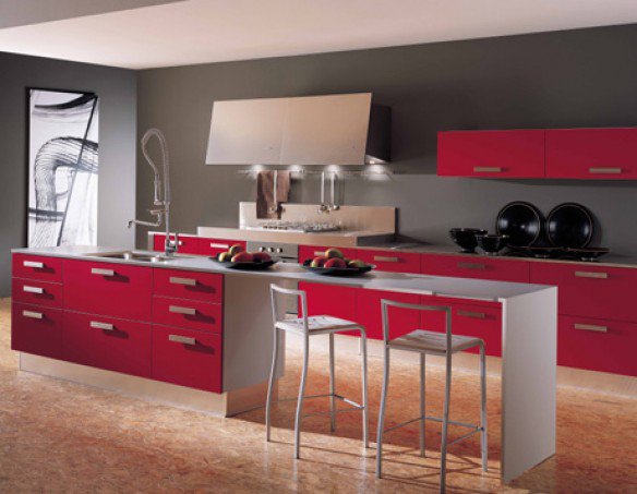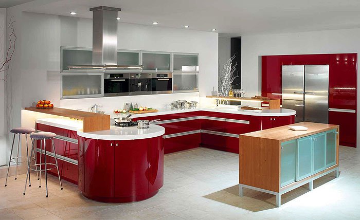 Модный и современный стиль хай-тек в оформлении кухни имеет характерные черты строгости кардинальных линий и форм, с резким очертанием углов всего пространства помещения. Четкость встраиваемых осветительных приборов и однотонность цветовой гаммы, должны создавать отражающие эффекты блеска металлических поверхностей. В данном стиле возможно включение контраста с помощью некоторых цветов, например, красного или синего, бывают варианты с зелеными тонами. Эти факторы напрямую зависят от личного вкуса хозяев кухни, которые решили оформить свою кухню в стиле хай-тек.