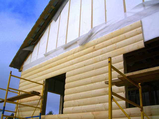 2. Работы по отделки стен блок-хаусом, необходимо начинать с монтирования вертикальной обрешётки. Обрешётку рекомендуется делать из деревянного бруса, либо рейки. Расстояние между каждым брусом или рейкой, должно быть не более семидесяти сантиметров. Между каждым брусом, необходимо вложить плиту минеральной ваты. Сверху минеральную вату, необходимо покрыть вторым слоем гидроизоляции.