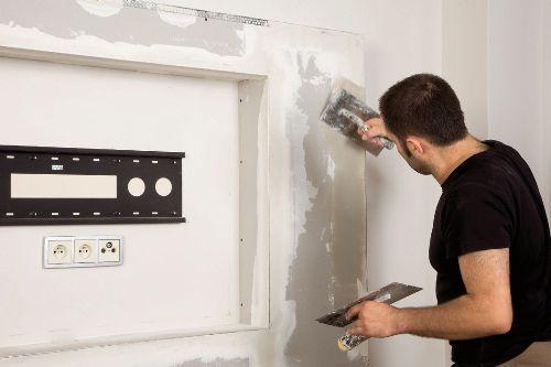При наличии по проекту подсветки, надо будет как раз уложить кабеля в необходимые места. Кроме этого, проверьте розетки и кабеля, чтобы они не мешали тыльной стороне телевизора, были расположены в необходимых местах и не гнулись. Затем прикрепите гипсокартон по углам.