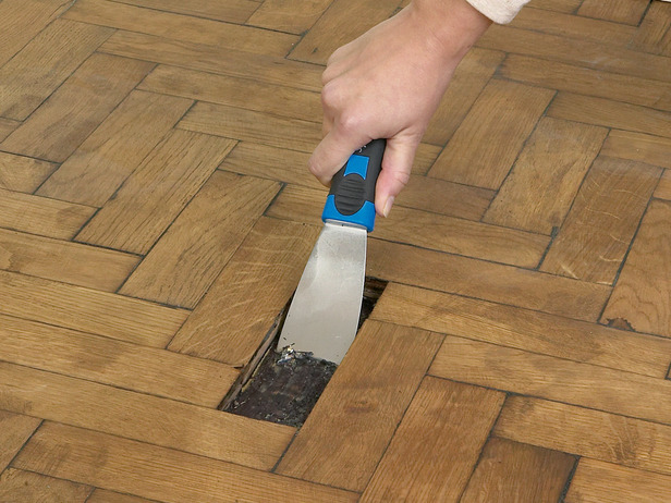 Начинать ремонт необходимо с визуального обследования поверхности. Затем во всех обнаруженных шатающихся паркетинах высверливается по небольшому, и вбиваются гвозди, шляпки которых тщательно утапливаются.