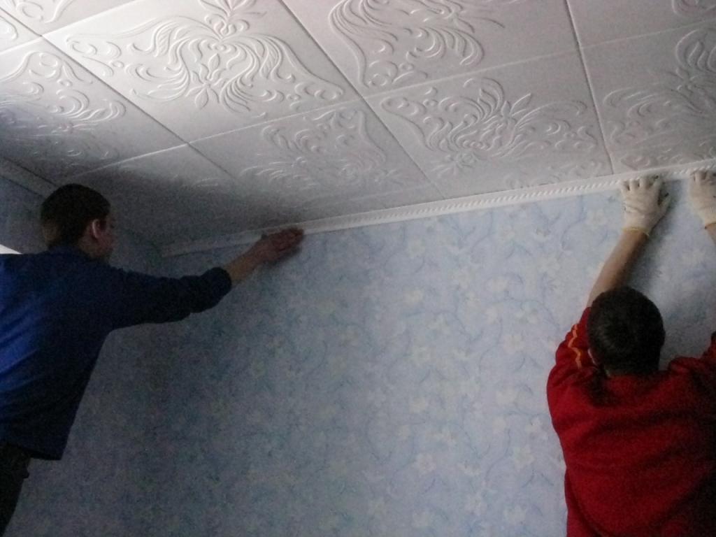 Для завершения работы необходимо скрыть стыки между стеной и потолком. Для этого придуманы особые элементы из пенополистирола - потолочные плинтуса. Работать с ними так же просто, как и с плиткой. Вам пригодится тот же самый клей, который вы использовали для приклеивания потолочной плитки.