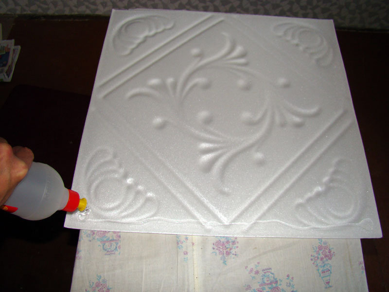 3) Легкость материала также обуславливает и еще один существенный плюс – легкость монтажа. Потолочная плитка очень легкая, прикрепляется на потолочный клей, не требует дополнительных усилий для приклеивания.