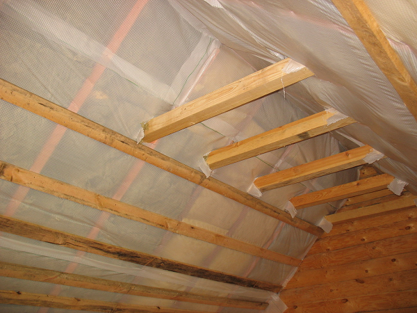 Пароизоляция монтируется строительным степлером, располагая стыки пленки внахлест на расстоянии около 10 сантиметров, иногда можно и больше. При большой площади помещения желательно прикрепить пленку еще и посередине, чтобы она тоже не обвисала.