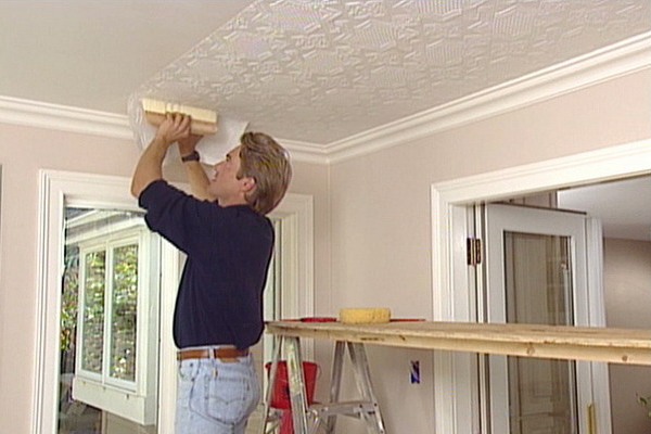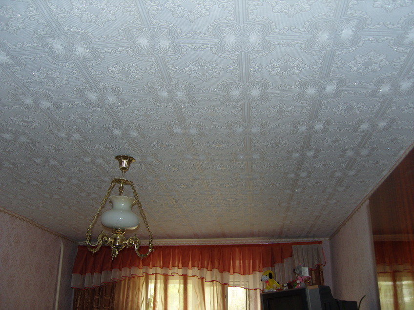 - тисненые обои скрывают недостатки потолка и хорошо красятся;