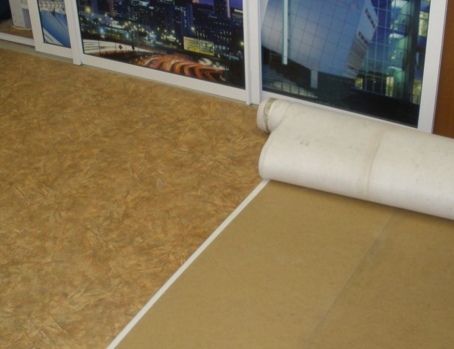 После полной укладки подложки стелют линолеум. Если у линолеума есть места задевания стен, их подрезают. В таком положении линолеум должен отлежаться день или два. Закатанный в рулон линолеум теряет свою форму и поэтому нельзя сразу застилать его. Если выполнить крепление линолеума к полу сразу, возможно появятся неровности или мелкие складки.