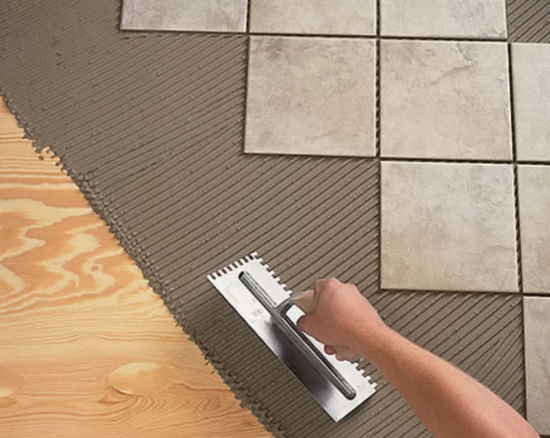 После выполнения выравнивания пола приступают к монтажу кафеля. Для выполнения кладочных работ применяют плиточный клей. Клей разводят в чистой воде до состояния, пока кельма будет стоять в нём. Также для повышения клеящих способностей немного добавляется цемент.