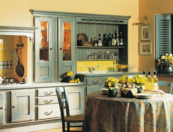 Не меньшее внимание уделяется отделке стен. Это может быть штукатурка (в том числе и венецианская), а также отделка из камня. Может не совсем обычно для кухни, но этот способ оформления стен характеризует его принадлежность к данному стилю.