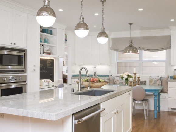 Особого подхода заслуживает зона, где вы и ваша семья будете принимать пищу. Едва ли вам хочется делать это в темноте. Исходя из этих соображений, постарайтесь подобрать освещение для этой области максимально грамотно. Даже если стол размещается недалеко от окна, это не значит, что у вас будет достаточно света. На помощь придут искусственные светильники, которые стоит разместить непосредственно над столом. В настоящее время выбор подвесных светильников чрезвычайно широк, так что вы можете не ограничивать себя в своих фантазиях. В зависимости от предпочтений в яркости, отдавайте предпочтение прозрачным или матовым плафонам.