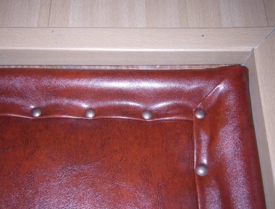 - Чтобы дверь была более привлекательной можно крепить кожзаменитель с помощью специальных мебельных гвоздей с красивыми шляпками.
