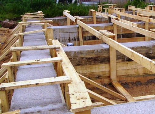 - Монтаж опалубки. Материалом для опалубки служат деревянные доски, заструганные с одной стороны, с толщиной 50 мм. Доски размещаются в траншее обработанной частью внутрь, жестко фиксируясь с помощью распорок и клиньев (очень важно не допустить последующего раздувания стенок). Стенки опалубки должны быть строго вертикальными, выходя на 0,3-0,4 м за уровень почвы – это послужит в качестве цоколя. Доски должны плотно прилегать друг к другу, во избежание протекания раствора. Для страховки иногда используют гидроизоляцию в виде пленки или рубероида. На этом этапе также закладываются коммуникационные входы и выходы. Перед заливкой раствора древесина обрызгивается водой – это послужит уменьшению потерь влаги из раствора. Если применяется кирпичный или бутовый тип основания, обустройство опалубки не требуется.