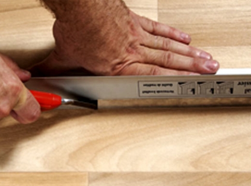 - Порезка линолеума с рисунком. Если материал содержит рисунок, его необходимо разложить рисунком кверху и аккуратно разрезать, используя длинную линейку. В месте окончания полотна ложится следующее: места соединений тщательно подбираются по рисунку и ложатся внахлест. После этого обозначается место будущего шва и фиксируется с помощью тяжелого предмета, для предотвращения смещений при разрезании, которое производится не спеша, острым ножом (оба слоя материала должны быть разрезаны за один прием). При большой площади пола подобную операцию необходимо производить, как правило, несколько раз, подбирая рисунок по каемке материала (лишнюю часть при этом аккуратно обрезают).