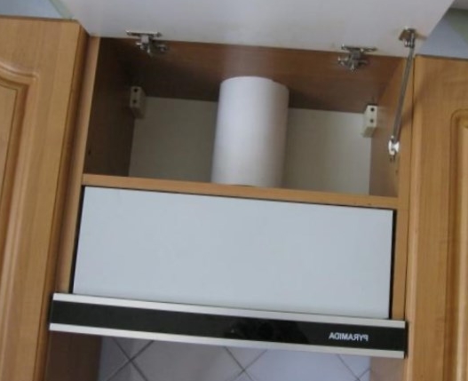 Такой вариант может похвастаться своей незаметностью, так вытяжка скрыта от посторонних глаз и встраивается в кухонный шкаф. Конечно же, его размеры нужно заранее подгонять, а иногда и вовсе покупать вместе со встроенным оборудованием.
