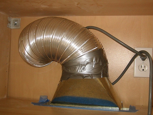 После подготовки места стоит вспомнить про отвод воздуха, ведь именно с ним вытяжка будет работать максимально эффективно. Прокладывать его необходимо ко входу в вентиляцию и лучше отдавать свое предпочтение гофрированным шлангам. Перед тем, как установить вытяжку, нужно прорезать специальное отверстие для этого отвода. Главное – это тщательно промазать места стыков герметиком и надежно закрепить хомутами.
