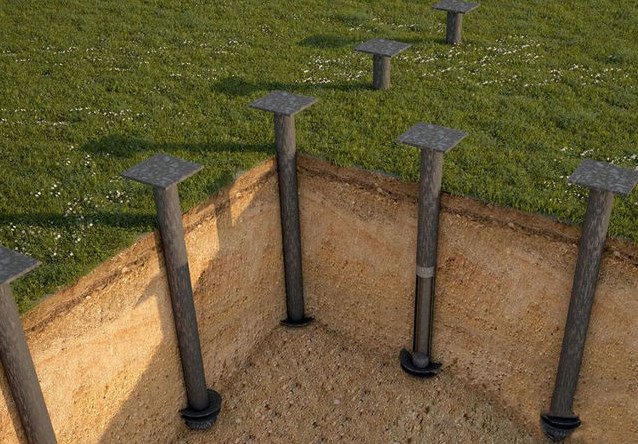 Под свайным фундаментом понимают особые столбы, отличающиеся наличием винтообразных лопастей и заостренных концов снизу, которые требуется забить или вкрутить в грунт. Если вы решили построить дом с использованием свайного фундамента, то, в первую очередь, потребуется пробурить скважины, диаметр которых будет равен диаметру используемых свай.